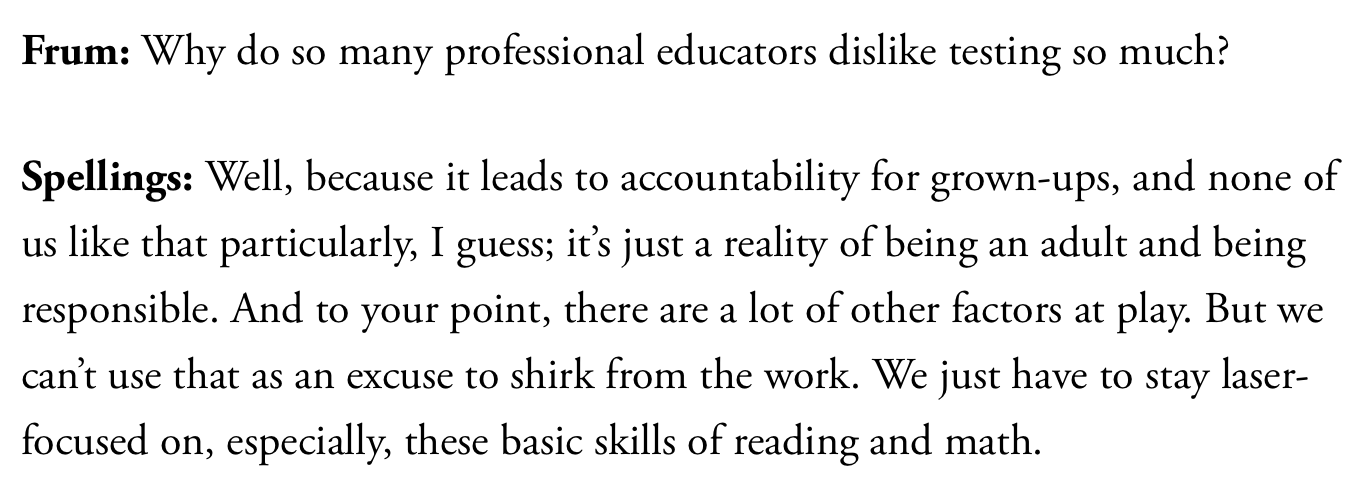 I regret to inform you that certain political pundits and education reformers are calling for the return of "high stakes testing." Or at least David Frum talked to former Secretary of Education Margaret Spellings in a recent podcast published by The Atlantic where this dismal idea was (once again, as always) posited as the fix for "the decade-long decline in U.S. student achievement." You know that the elite are fresh out of ideas when they have to wheel out a member of George W. Bush's cabinet to talk about policy proposals they promise (this time, really) will revitalize the country.