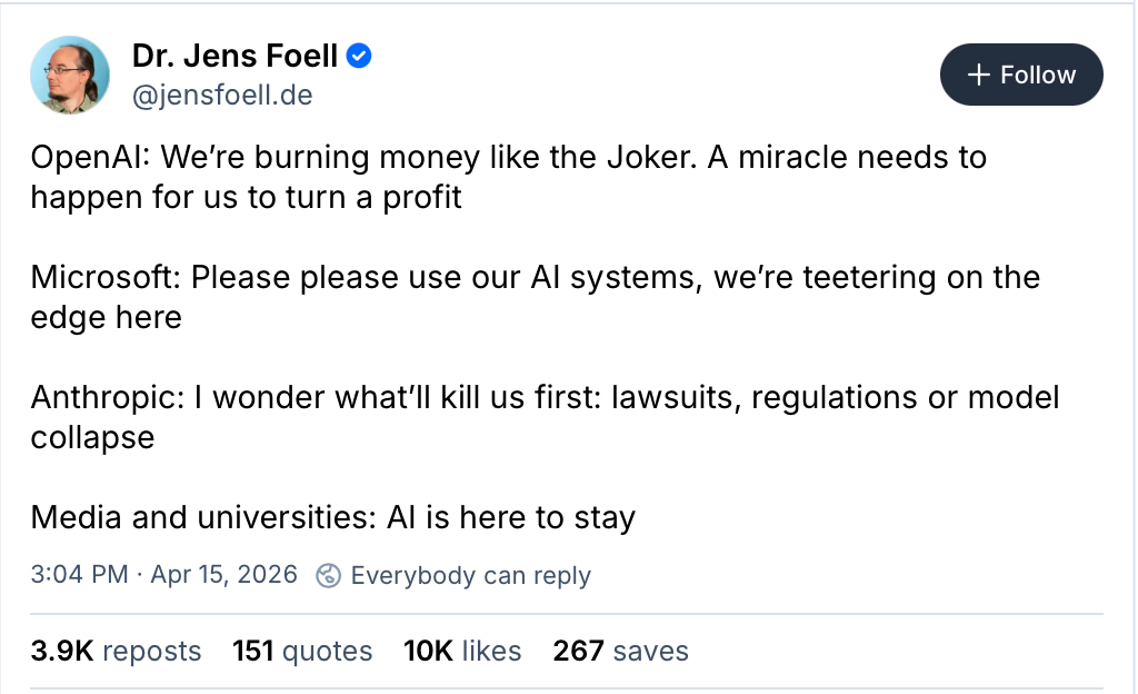 Perhaps, as more and more of the Web disappears, as sites have gone offline and links decayed, those who’ve proudly stated they were relying on it as their “outboard brain” might be the first to speak up and caution against depending too much on the latest “outboard brain,” the LLM. This seems particularly wise as “AI” companies are all incredibly over-extended financially, instituting rate limits on just how often you can use the technology – not because demand is so high as much as they can't afford for you to do so. (Just imagine having to wait a few days before you can “remember” or “think” or “write” because you’ve already burned through all your allotted tokens. Seems... dumb?)