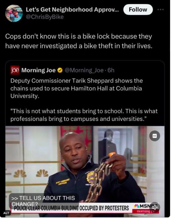 Speaking of propaganda, the NYPD tried to argue that their violent crackdown on students at Columbia was necessitated by the heavy duty chains used to barricade the doors. "This is not what students bring to school," the deputy commissioner told the press. Actually, it turns out these chains were, in fact, the very mechanism that the university had suggested that students use – even sold to students – to protect their bicycles in a city renowned for bike theft.