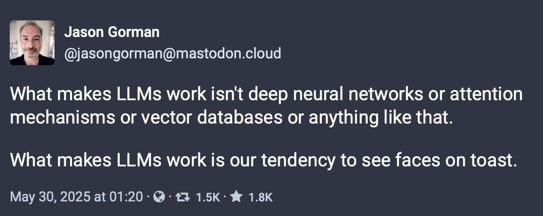 I also very much like Bender and Hanna's phrase "text extruding machines," as it conjures images of "AI" as pink slime – not chicken, but not not-chicken, pink-slime makers assure us. I'm going to stop writing "generative AI" because I like the word "generative" too much to have it associated with McNuggets of textual slop. I'm also going to keep using "AI" instead of "artificial intelligence" and using those scare quotes, because 1) the phrase is used to paper over a lot of different technologies, 2) is still bound up in as much science fiction as it is real science, and 3) is not "intelligent," whatever the hell that means (derogatory).
