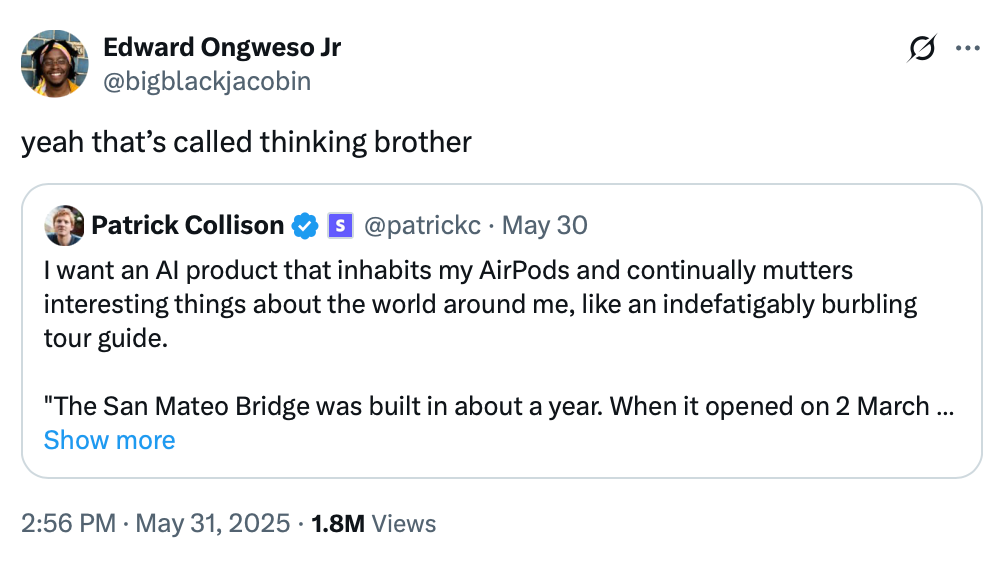Meanwhile in techno-fascism: Meta is working with weapons-maker Anduril (a company founded by Palmer Luckey, who sold his company Oculus to Facebook in 2014) to build military technology. Meta also inked a deal for nuclear powered data centers. The US is storing migrant children’s DNA in a criminal database. Silicon Valley wants to help me make a superbaby. Should I let it? Trump taps Palantir to compile data on Americans. (The head of Palantir in the UK is Louis Mosley, the grandson of arguably one of the most famous fascists in British history.) This is where the money and the power are right now: cop shit. And you are kidding yourself if you don't think that's what "AI" in education means. I mean, maybe it doesn't mean that for you personally, but show a little solidarity with those that it does, eh?