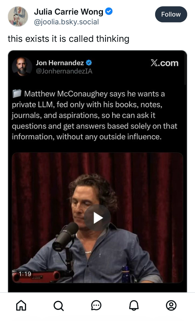 I told Wallach that this push for "personalized learning" – everyone's just rebranded this as "AI" now – is no damn good as it disrupts this relational, reciprocal aspect to learning. When we isolate everyone on a screen, via an algorithm, and pretend the primary values in education are efficiency, optimization, and "individualization," then we lose all sense of community, all sense of responsibility to one another. And that is how we learn – in relationships with people, their words, their ideas, their embodied selves.