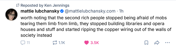All of this strikes me as both a grotesque structural failure – again, there should be no billionaires – as well as a deeply moral one. The Epstein files are full of mentions of powerful (and less-than-powerful) people who were clearly eager to associate themselves with wealth and power and willing to overlook the child sex-trafficking that was happening right in front of them. And here we are today, with too many people seemingly quite comfortable with the exploitation and violence wrought by the technology industry as long as they think it gives them personally a boost, as long as it positions them “at the table.”
